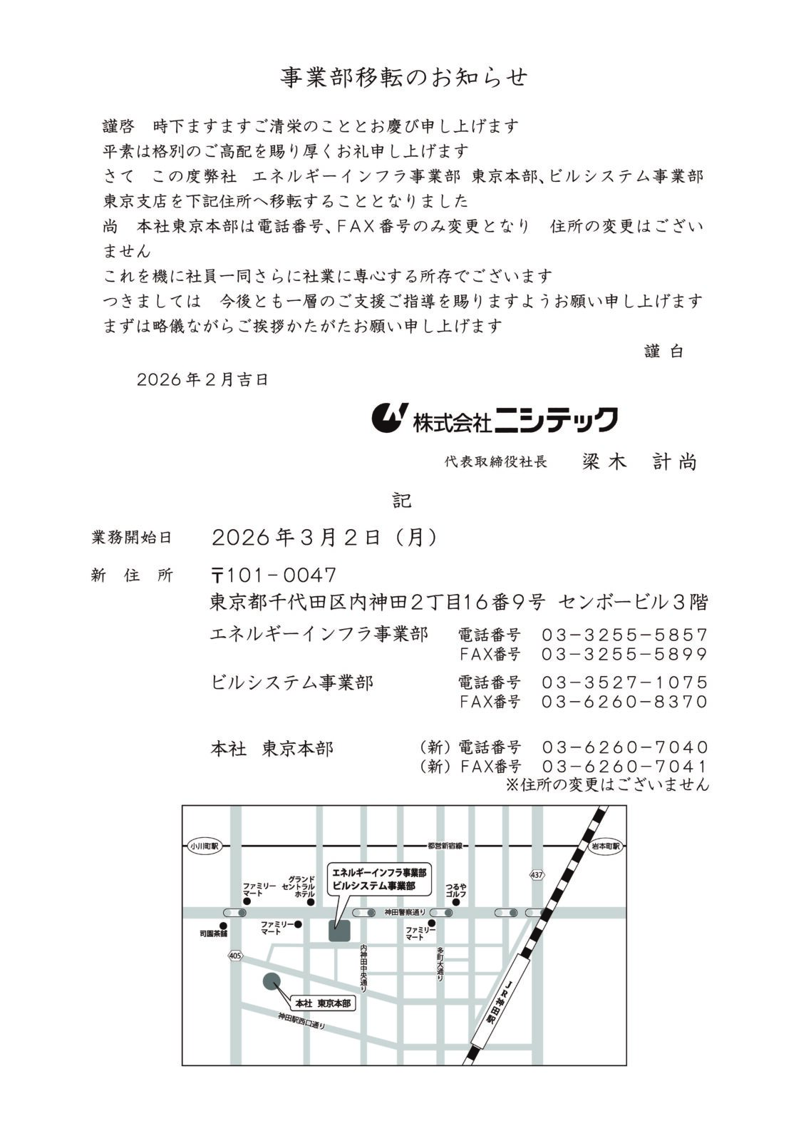 事業部移転のお知らせ 平素は格別のご高配を賜り厚くお礼申し上げますこの度弊社 エネルギーインフラ事業部 東京本部、ビルシステム事業部 東京支店を移転する運びとなりましたので、ご案内申し上げます。 今後とも一層のご支援ご指導を賜りますようお願い申し上げます